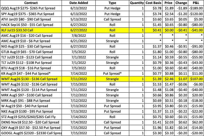 - AMC is pushing through the 100day sma and key 16 resistance level, and the Aug19 $16 – $20 call spread roll up has moved nicely into the money. The plan will be to scale back risk further on the bull portion of the strangle by closing the current spread and rolling up to a tighter Aug19 $18- $20 call spread. The next target is 18+. The bear portion of the strangle will remain open.