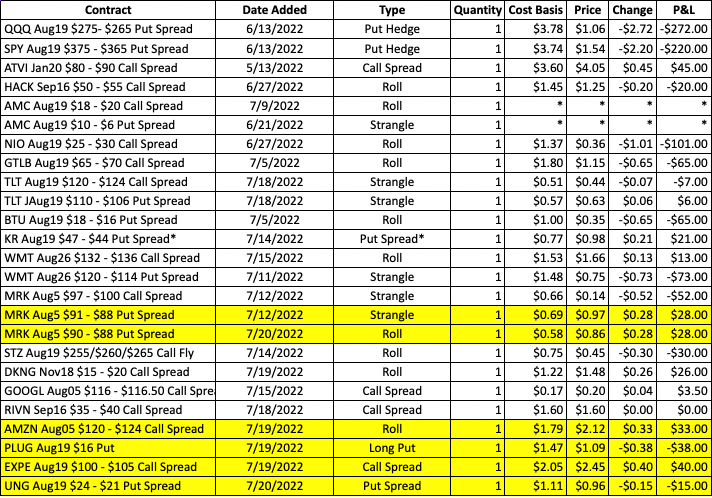 AMC has popped to 18+ early this morning, and after hitting the last target for the trade, the Aug19 $18 – $20 call spread roll-up will be closed. We can also close the Aug19 $10 – $6 put spread now to wrap up the remainder of the strangle.