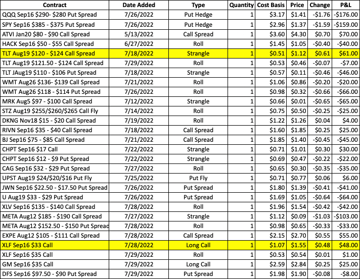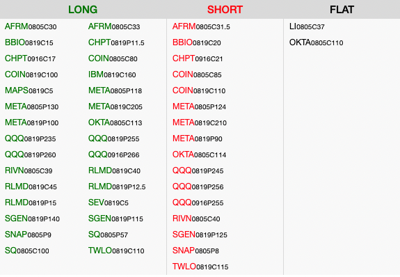 ATVI is scheduled to report after the close today, though earnings are not expected to be a significant event (the Aug05 straddle is only pricing in ~$2.15). The company is in the process of being acquired by MSFT, so the biggest development would be if there is a material update on the progress of the deal. The Jan20 $80 – $90 call spread is a longer-term strategy targeting a narrowing of the deal spread and it will remain open into the earnings release. We are still looking for a move into the low-to-mid 80s to scale back risk on the position.