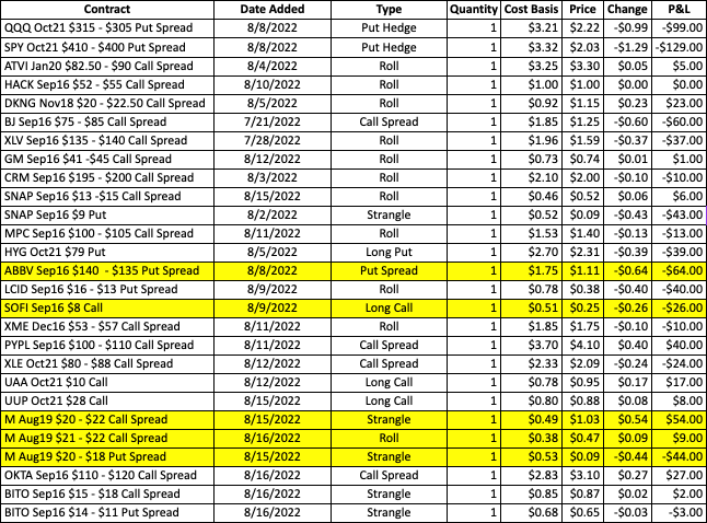 BJ‘s is scheduled to report results before the open tomorrow, and the stock is down marginally in late morning action. The bull setup was targeting a break of key multi-month resistance around 70 prior to earnings. The stock has struggled to sustain any traction above that level, though, and with it currently slightly under 69, the setup into the report is less clear. Retailers have had a mixed week of news, so instead of taking the added risk into the report, the BJ Sep16 $75 – $85 call spread will be closed today. If you’d like to take options into the print, just make sure to plan your size accordingly.