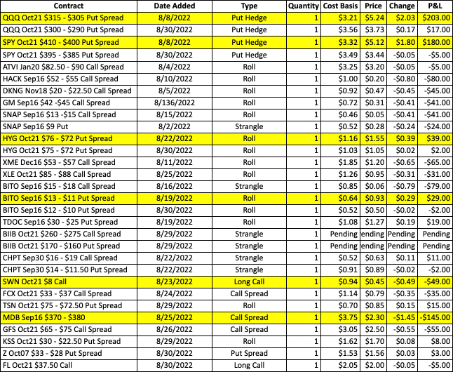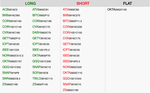 CHPT had a solid print after the close yesterday, and the stock is running out of the gate this morning. The 11%+ rally has the Sep30 $16 – $19 call spread nicely into the money, so the plan will be to reduce some risk on the bull portion of the strangle and roll up to a tighter Sep30 $17 – $19 call spread. The next target is 17.50+. The bear portion of the strangle will remain open for now.