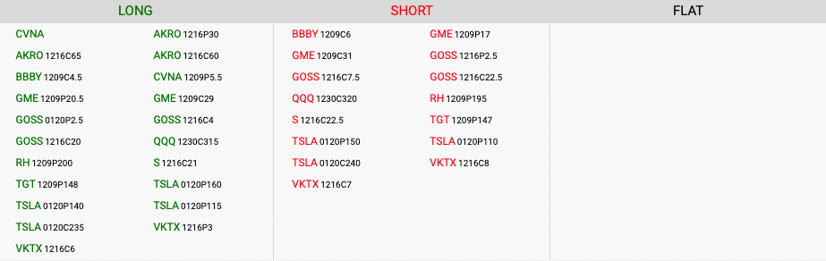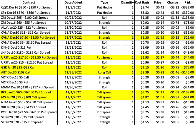 CVNA didn’t want to crack the key 6.50-6.75 support level yesterday, but it is flushing sharply through it this morning. A downgrade and a negative article have combined to knock CVNA lower by ~30% in the premarket, and the Dec30 $6 – $3.50 put spread roll down is well into the money. The plan will be to book the put spread to lock in the gain and close the Dec30 $11 – $15 call spread at the same time, as the likelihood of a large bounce from here is low.