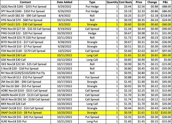 FDX has shaken off a pre-market downgrade and is hanging up ~1% in afternoon action. Peer UPS will have earnings tomorrow morning, and the numbers should have an impact on FDX similar to what took place in September. With FDX in a tight range since the start of October, a move to >160 or <148 should trigger a larger, sustained move, so we will open a short-term Nov04 $148 – $144 put spread hedge to hold with the current Nov18 call spread. We will update the position after UPS results are digested by the market (either tomorrow or Wednesday).