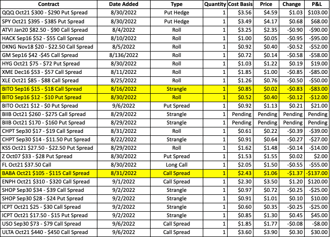 GM has stabilized above the 20day sma, keeping the recent uptrend intact, and giving us a reason to stick with a bullish trade. The current Sep16 $42 – $45 call spread is the last of several roll ups and is running low on time, so the plan will be to close the position and roll out to an Oct21 $42 – $46 call spread to buy more time for the trade to develop. This will require extra debit, so we will approach it similar to a new trade by having a tight stop at 37.25 or a 40-50% net debit loss.