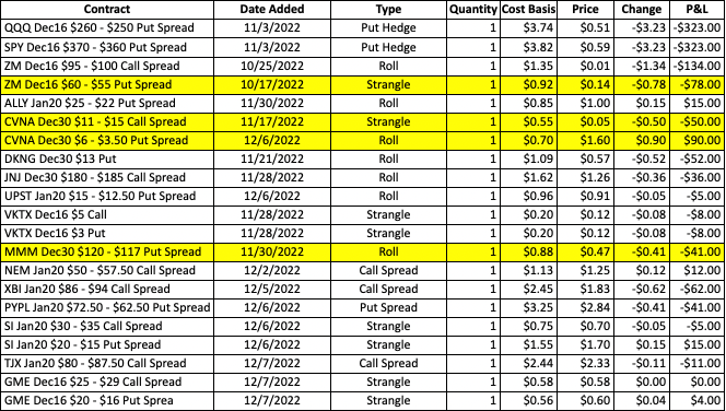 It’s taken all day but GME is finally nearing 25 and the bottom of the Dec16 $25 – $29 call spread. The stock has been grinding higher all session, though never extending quickly to the upside. While we were targeting a $3.50 – $4.00 move for the strangle, the slower action (and large upcoming market-wide catalysts) makes it more important to scale back risk earlier. The plan will be to close the current call spread and roll up to a lower debit Dec16 $26.50 – $29 call spread. The bear portion of the strangle will remain open for now.