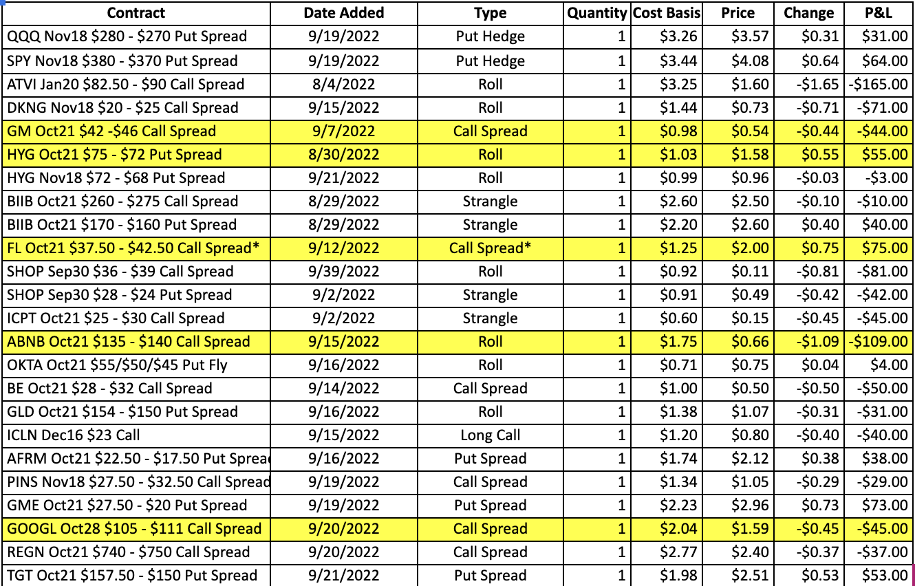 - GME is nearing the initial target range, so it is time to lock in some money on the Oct21 $27.50 – $20 put spread. The plan will be to close the current spread and roll down to a tighter Oct21 $25 – $20 put spread. The next target is <24.