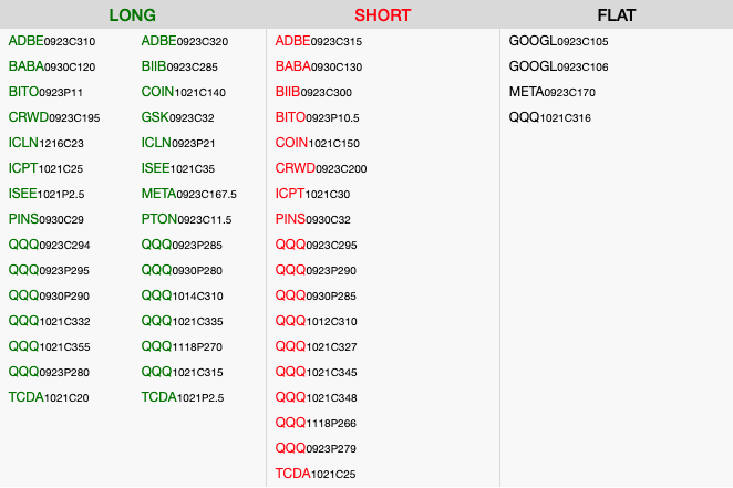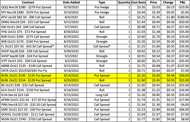 Fed days are always characterized by late action, and today is no different. Another reversal has now driven the indices back near the low of the session, and GOOGL is sliding below the huge 100 level to hit the stop for the Oct28 $105 – $111 call spread. We want to make sure to exit this position before a major breakdown can develop, so the trade needs to be closed this afternoon.