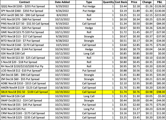 - LCID is at the stop level. The bounce this morning is sending the stock up near 14 and the Nov18 $12 – $10 put spread needs to be closed.