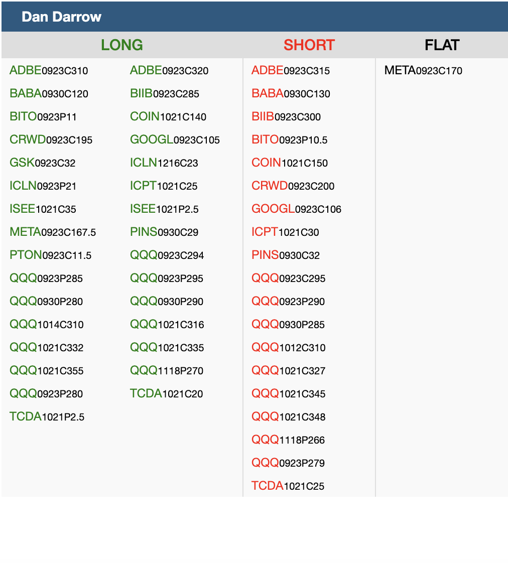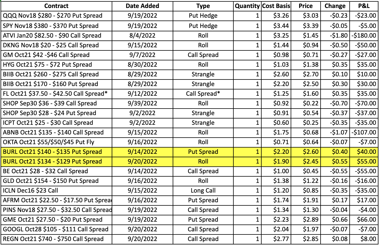- TGT has caught a bid today following a bullish analyst note on WMT, but the stock is still below the key 50day sma. The breakdown pattern is still intact, so we can move forward with the Oct21 $157.50 – $150 put spread, though we will use a technical stop at 167 (above the 100day sma) in addition to the 40-50% net debit loss stop.