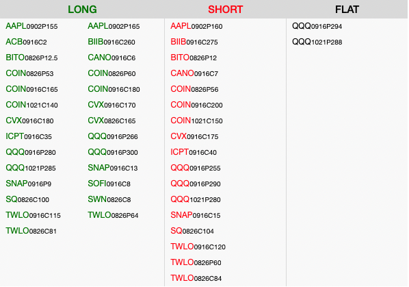 - PYPL is at the stop for the Sep16 $100 – $110 call spread. After acting strong and consolidating above 100 as recently as last week, PYPL has turned lower quickly, with today’s drop putting it below the d8ay ema and 20day sma. The trade needs to be closed this morning as the bull thesis has changed.