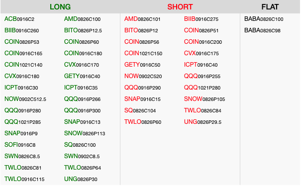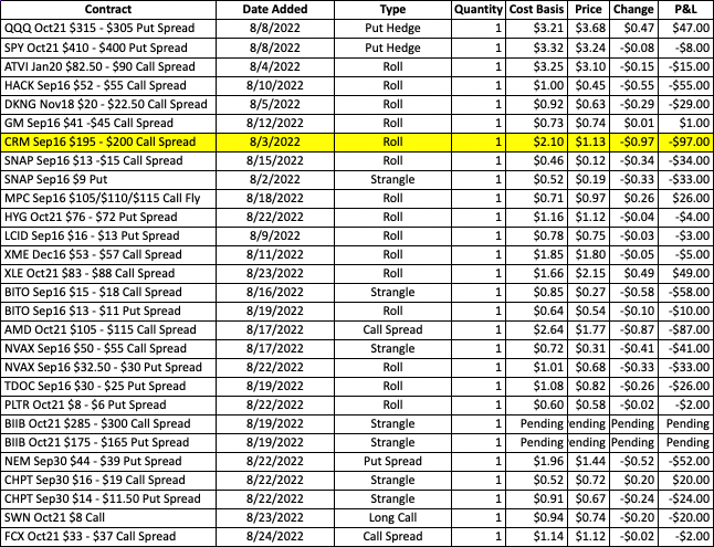 NEM was a tight bearish setup that looked set to resolve lower as the stock broke key support at 44 a few days ago, but the stock has seen little follow-through lower, with a recent bounce resetting support. The Sep30 $44 – $39 put spread has a tight technical stop at 45 (a reset above the 8day ema and 20day sma) which is getting hit this morning early, so the trade needs to be closed before the stock can build momentum out of the lower consolidation.