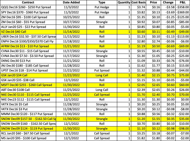 We are going to lock in the remainder of NKE. The stock has pushed green after opening red, and the late afternoon rally has led to a test of the critical 200day sma and a move near the 112.50 secondary target. The plan will be to close the Dec23 $112 – $115 call spread roll up and book the fast winner. We may revisit a new trade on this closer to earnings.