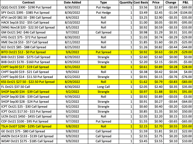 ORCL‘s nearly 2% rally has skewed the Sep23 strangle much more in favor of the bull side, and that is not what we wanted for the strategy. A relatively balanced 50/50 split is more ideal for this setup, so we need to adjust the contracts for the trade. The new strategy will be: