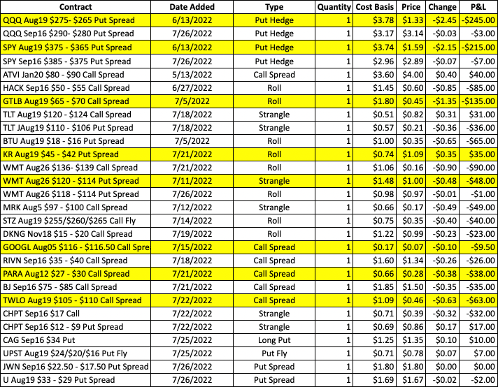 Fed days are always interesting, though not always smooth trading sessions. With a deluge of earnings-related news from yesterday and this morning, an already-busy day will get even busier at 2:00 PM est this afternoon when the Fed makes its interest rate decision (75bps is expected), and Powell holds his press conference. We’ve already adjusted up/out the QQQ and SPY hedges, but we will hold off managing other trades until closer to 3:00 PM est (if necessary) to let the announcement get digested and let the market figure out direction. Sizing down can be a good approach on Fed days to help prevent getting spun around and chopped up, but sticking to targets and stops is important regardless of the position sizing.