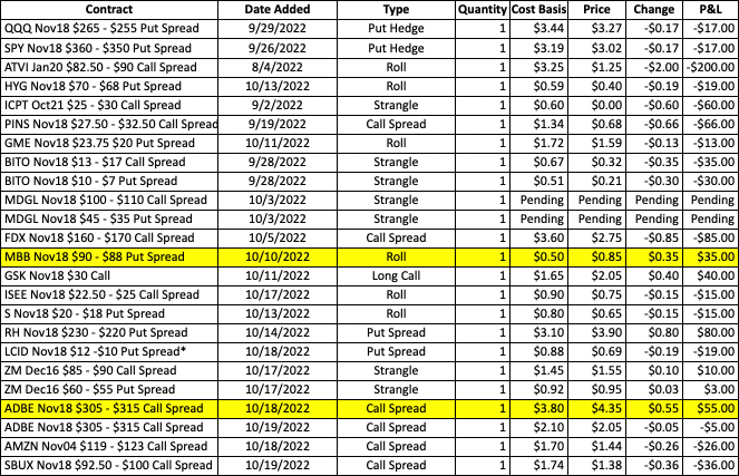 Another big morning rally has fizzled, and indices are losing steam quickly into the afternoon. RH is beginning to slide below last week’s low and it is into the initial target range (<232). The plan will be to close the current Nov18 $230 – $220 put spread and roll down to a Nov18 $220/$210/$200 put fly (standard ration 1:2:1). The next target will be <220 or a 70%+ gain for the put fly.