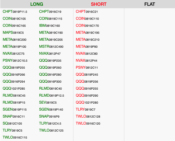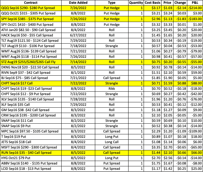 EV and Green Energy-related names are a little weaker this morning as traders take profits across the group, and RIVN is down modestly in the premarket along with them. RIVN had a strong finish yesterday to send the Sep9 $37 – $42 call spread roll up nicely into the money, so with earnings coming up this week, we will work quickly this morning to reduce risk on the position. The current spread will be closed and a tighter Sep9 $40 – $42 call spread will be opened. This may be carried into the earnings report, depending on how the next couple of sessions play out.