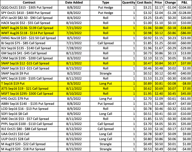 Weakness across Tech this morning is weighing on many names that have had large recent runs, including SOFI. The stock has been retreating off its post-earnings high, and while it looked stable as it held the 8day ema the past few sessions, today’s drop is sending it under that moving average and triggering the debit stop for the Sep16 $8 call. The position will be closed for now, and we can potentially revisit a new trade on this if it resets above 8 in the near term.