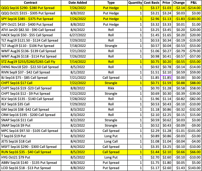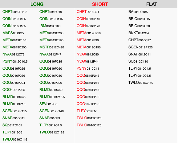 STZ is losing ground in afternoon action, and the late slide is sending the stock below the key 100day sma. The Aug19 $255/$260/$265 call fly was a low debit roll up after the stock popped quickly to 250+ in July. STZ has not managed to make a push above 250 since then, though, and with time running low and the stock losing moving average support, it is tough to justify continuing to hold the position. The remainder of the trade will be closed this afternoon.