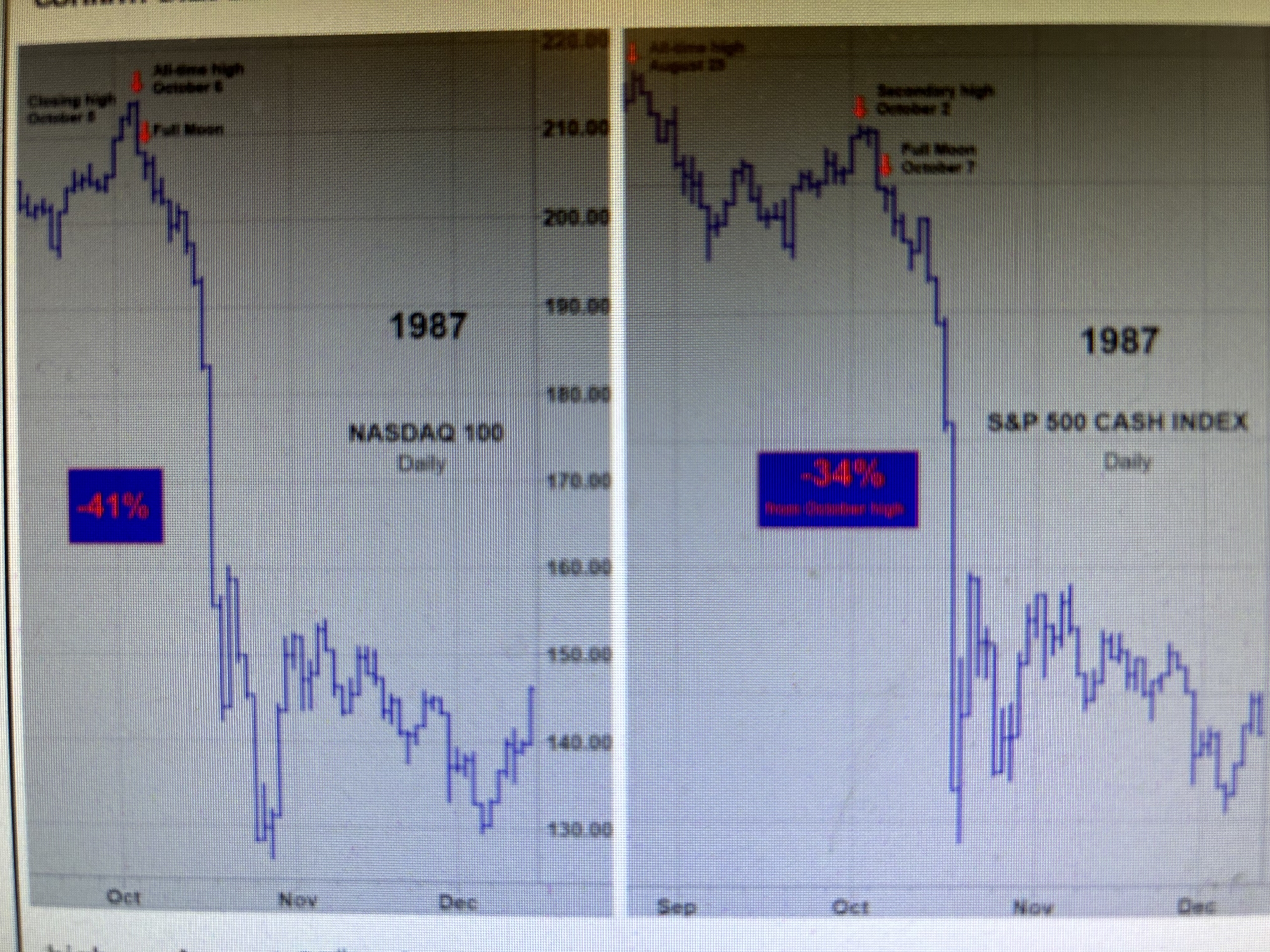 The solar eclipse in 1987 was on September 23. Note that the NDX made its all-time high on October 6 just one day prior to the full moon.