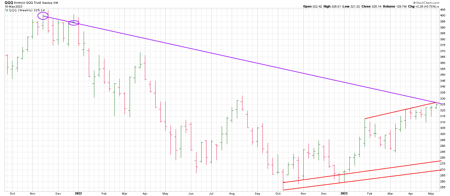 A weekly QQQ from the all-time high shows a close-only trend line was hit this week.