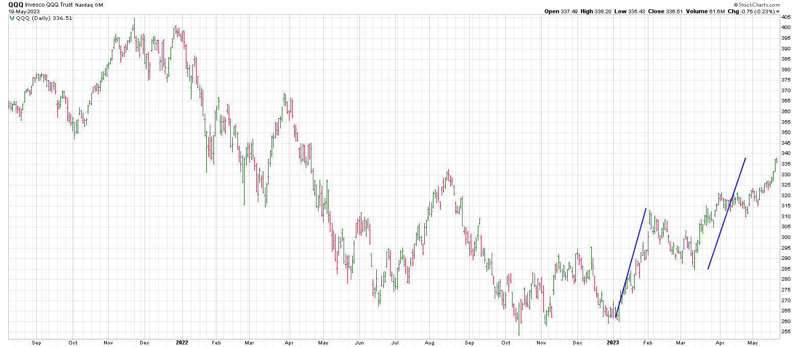 QQQ hit 338.20 on Friday, May 19th before reversing to close down on the day.