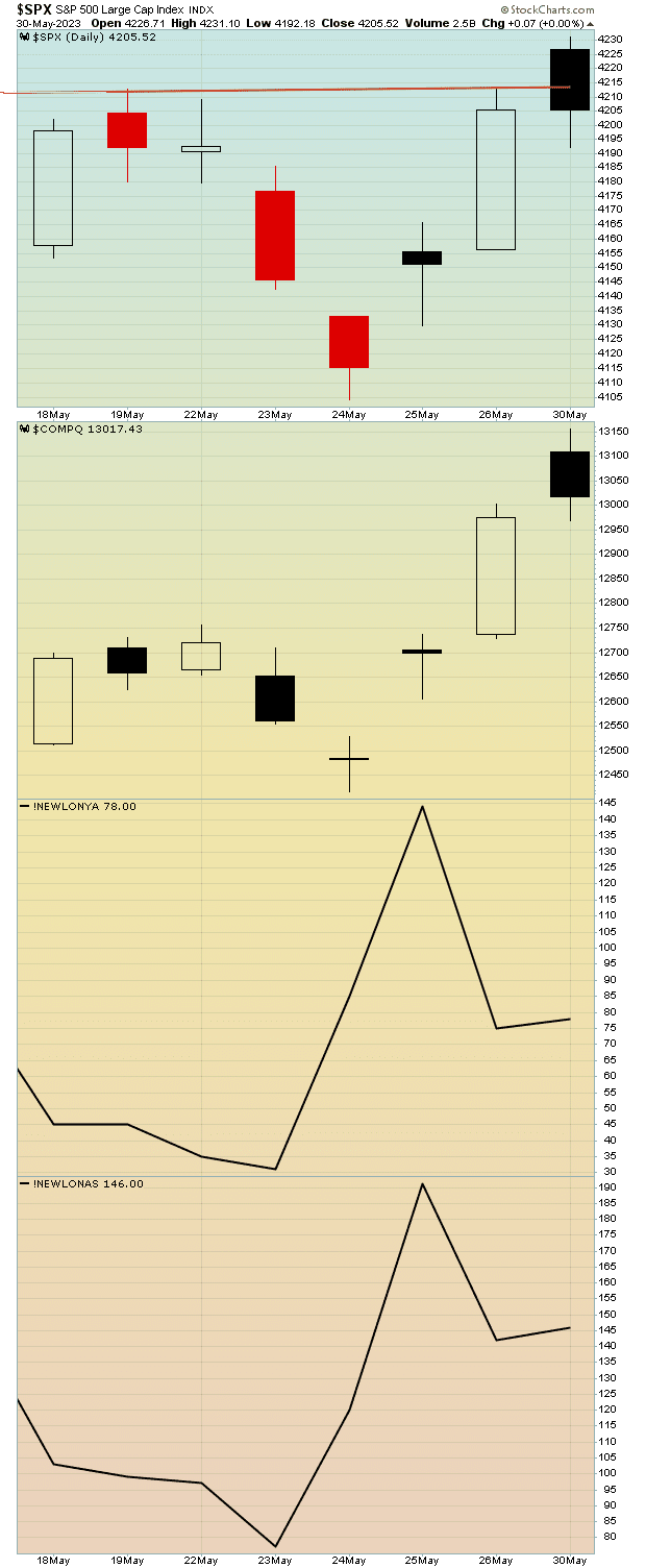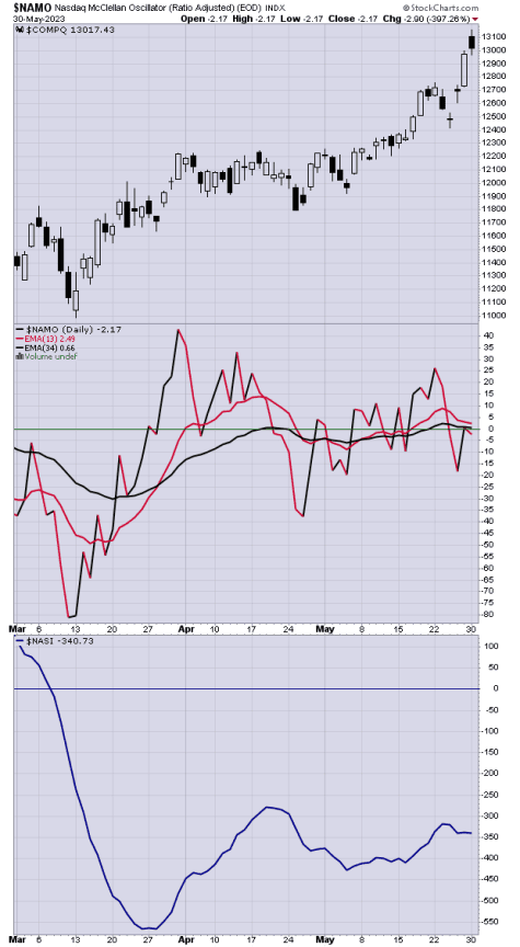 In addition to the fact that today which SPX and COMPQ each set new 2023 highs, NYMO and NAMO are bot BELOW ZERO, and the Summation Indices for each the NYSE and the NAZ are in decline.