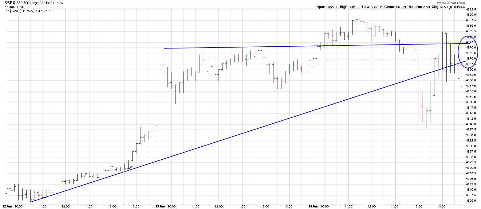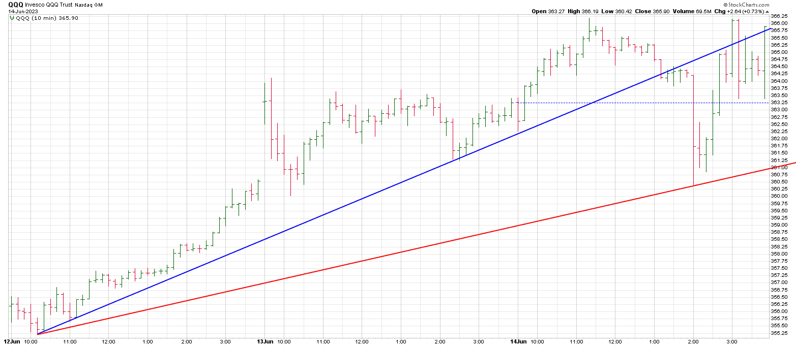 Let’s take a look at a 10 min chart for Wednesday for both the QQQ and SPX.
