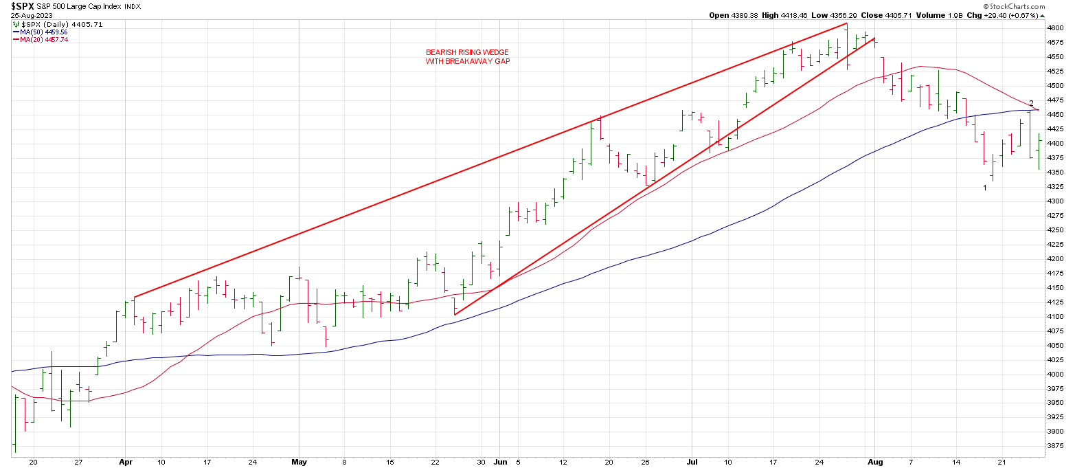 The SPX dropped out of a Rising Wedge immediately following a Key Reversal Day on July 27th.