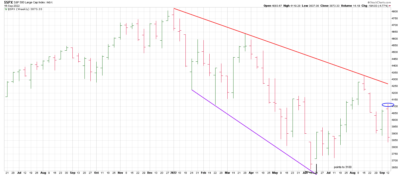 Markets like to play out in threes. Notice how the mid-August peak is the third point in a declining weekly trend line.