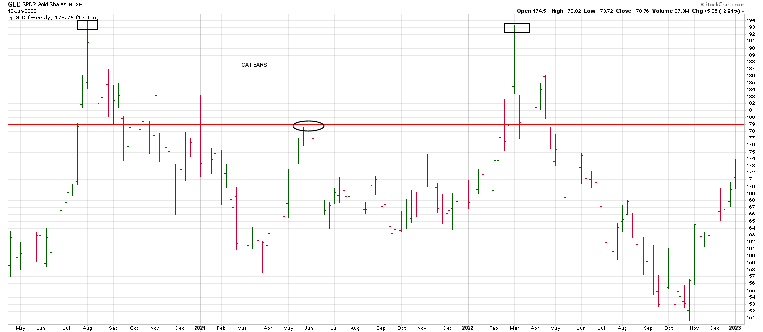 A weekly GLD shows the all-time high in August/September 2020 and the high in March 2022 forming a big Cat Ears double top.