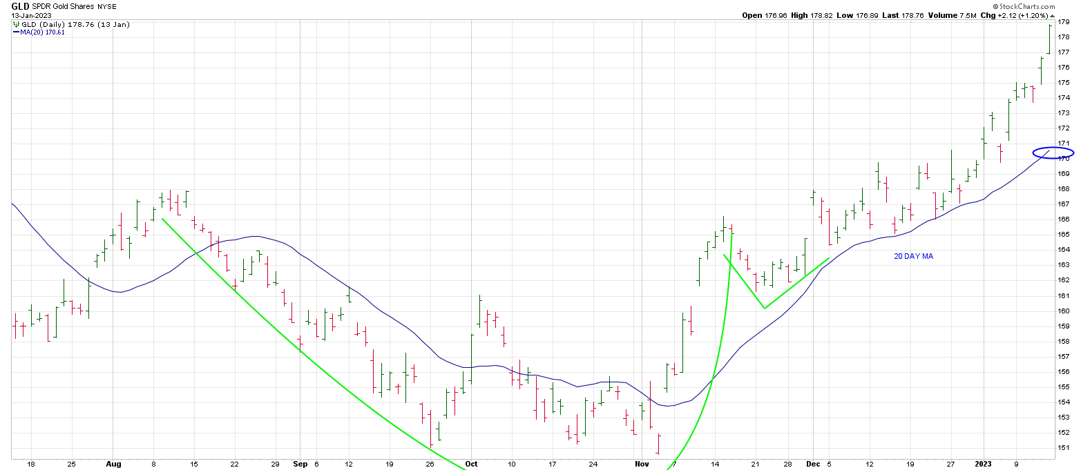 Since breaking out of the Cup and Handle, GLD has been coasting up its rising 20-day moving average.