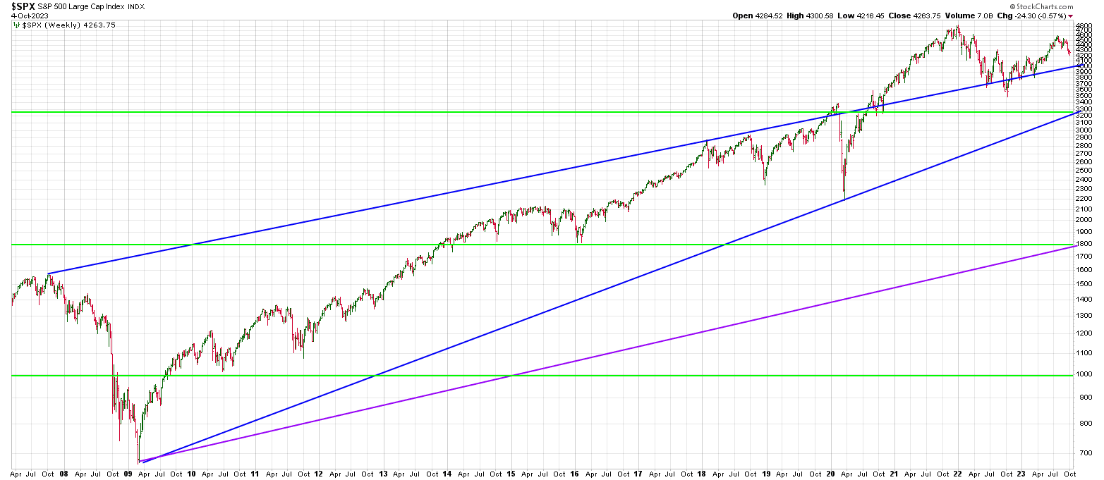 A weekly SPX from the 2007 top connection the 2018 highs (upper blue line) shows a blow off and a backtest.