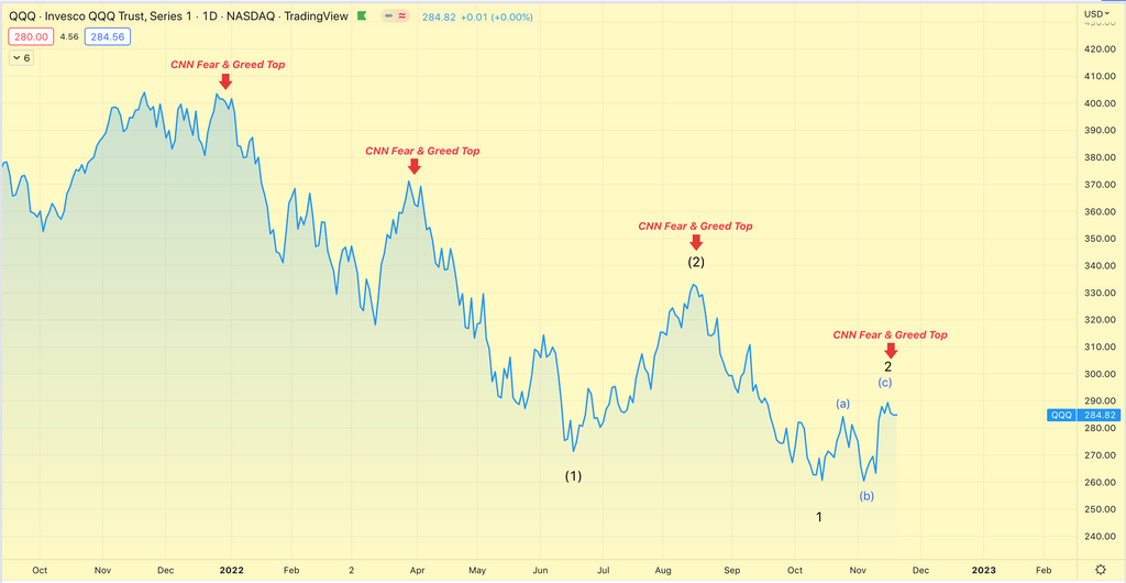 Below is a QQQ daily with the year-to-date Fear & Greed top signals.