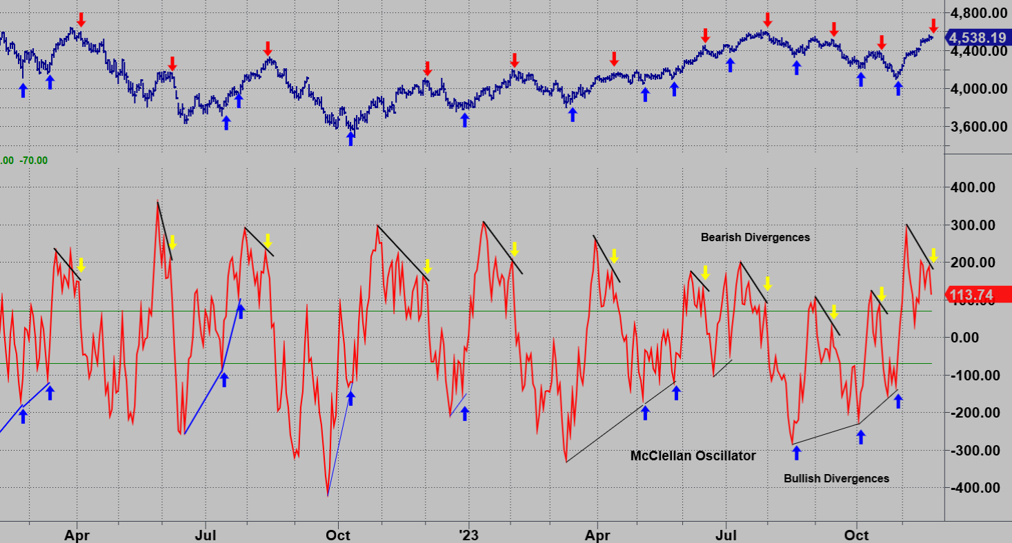 2) The next chart is of the McClellan Oscillator. It focuses on the divergent signals both bearish and bullish..