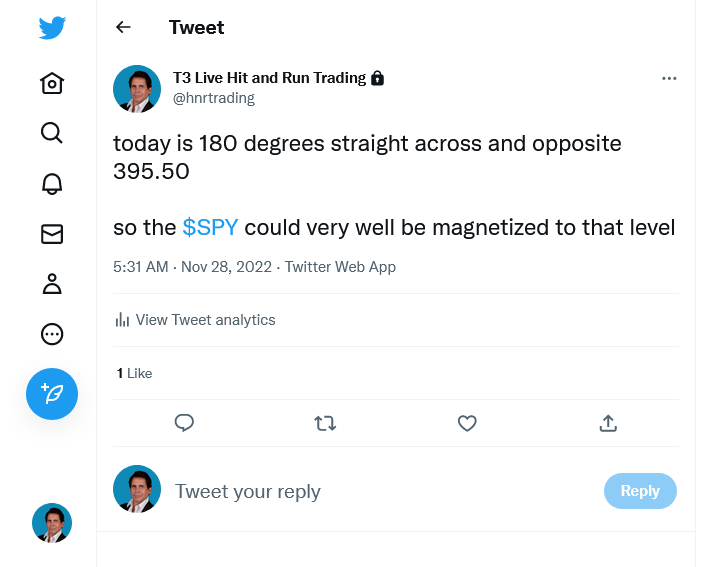 We also stated that Monday, November 28th is 180 degrees straight across and opposite 395.50 (3955) on the Square of 9 Time & Price Wheel and that our expectation was the SPX could be magnetized to 3955 yesterday.