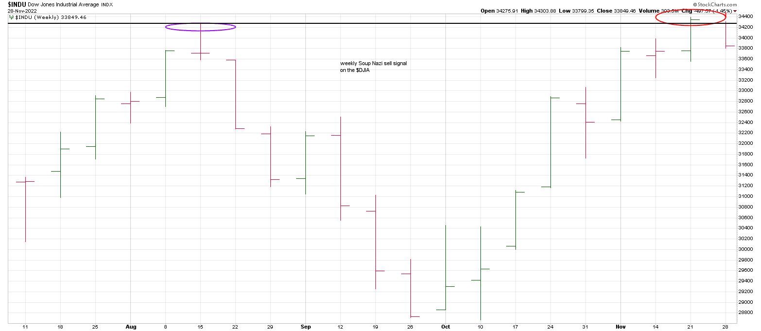 Notably on Monday the DJIA flashed a WEEKLY Soup Nazi sell signal.