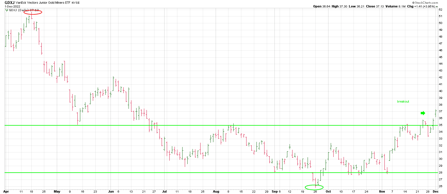 Check out the November 3rd pivot on the above daily GDXJ. The next day GDXJ gapped up and has not looked back since.