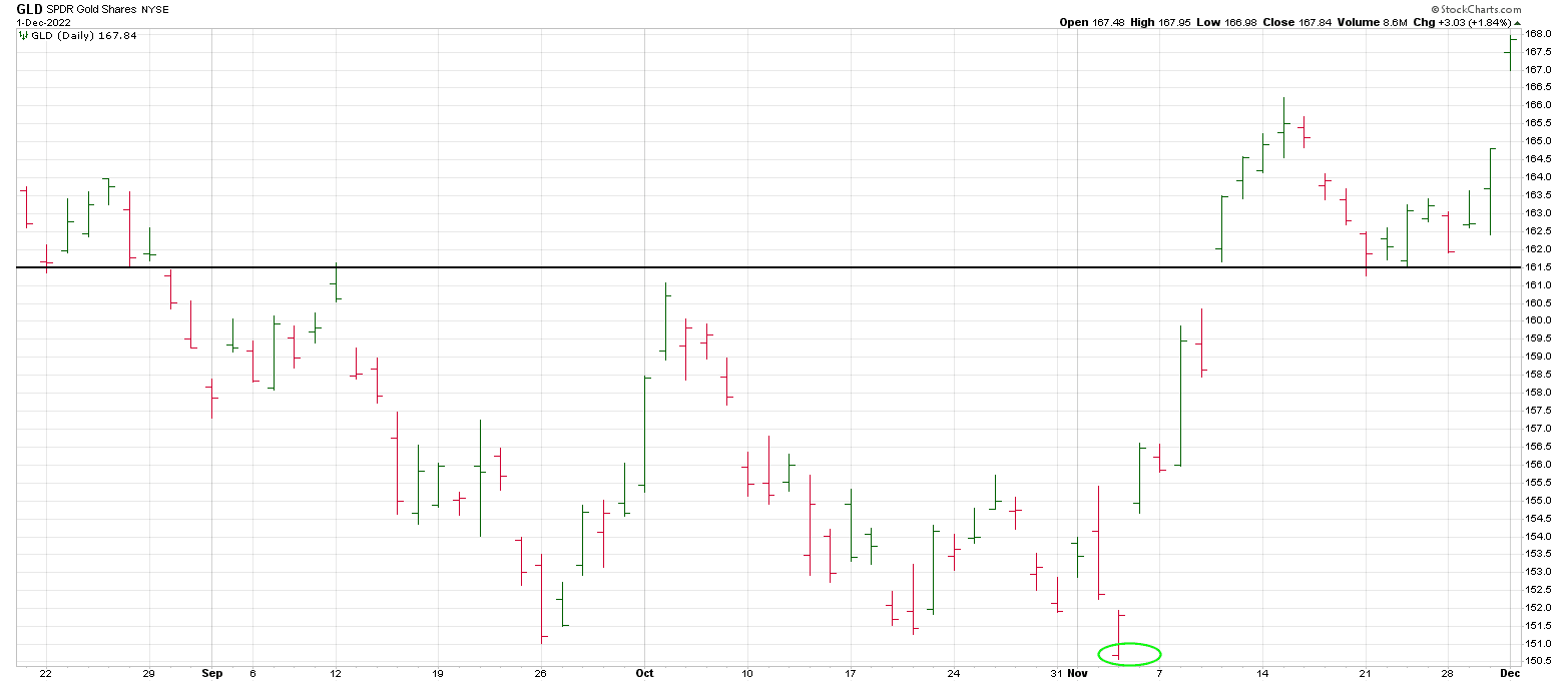 We wrote that GLD left my Gilligan to buy signal pattern on November 3rd.