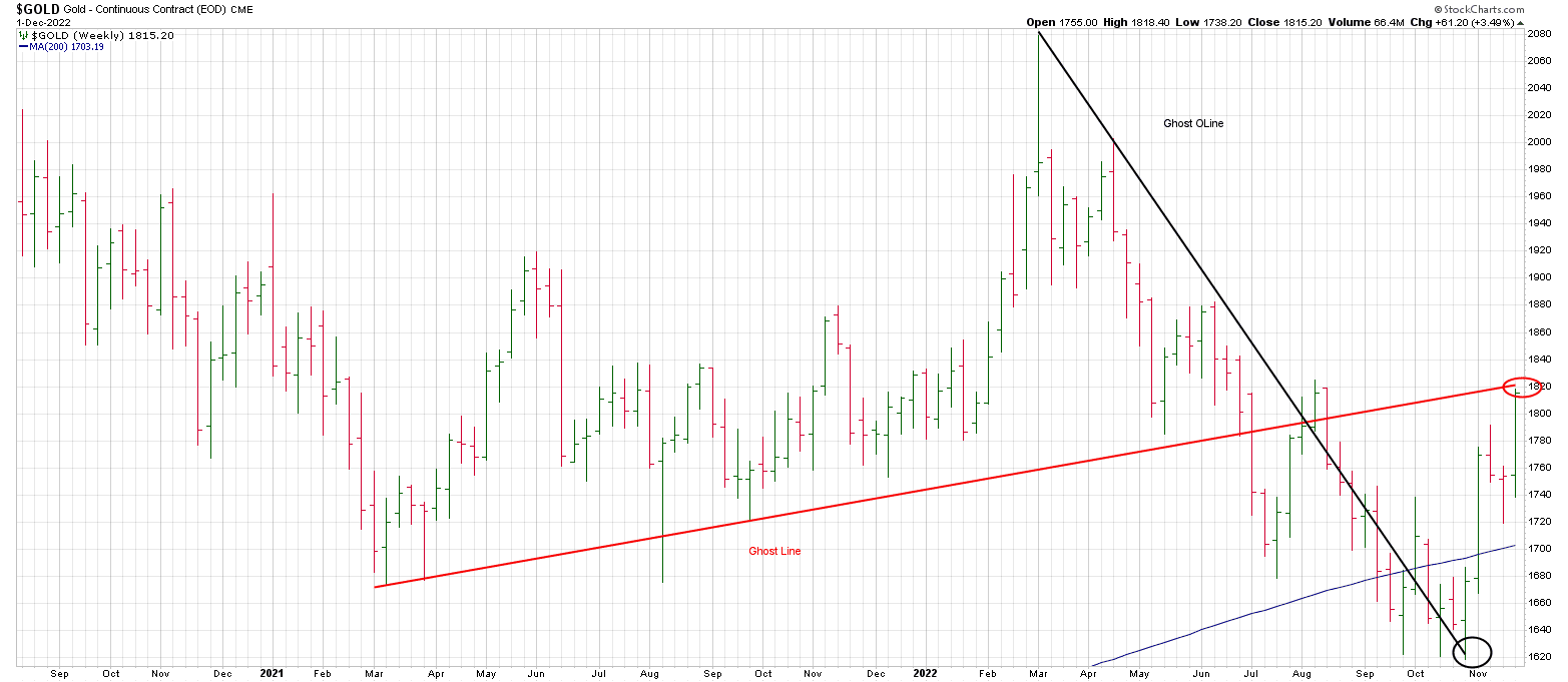 On Thursday GLD spiked to backtest the red Ghost Line that has defined important price regions for almost two years.