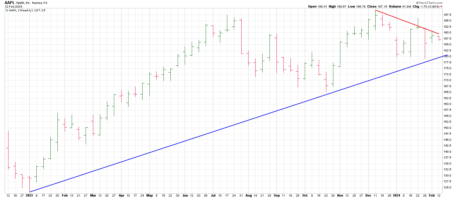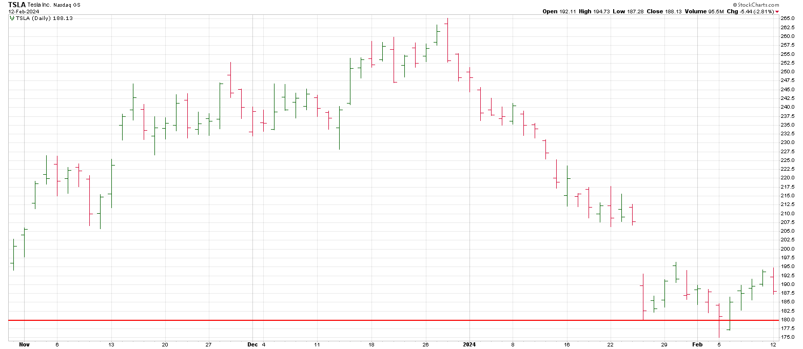 It shows triple bottoms at its 200 day moving average. Breakage below those bottoms at 180 opens the door to test of last October’s lows, 25 points lower.