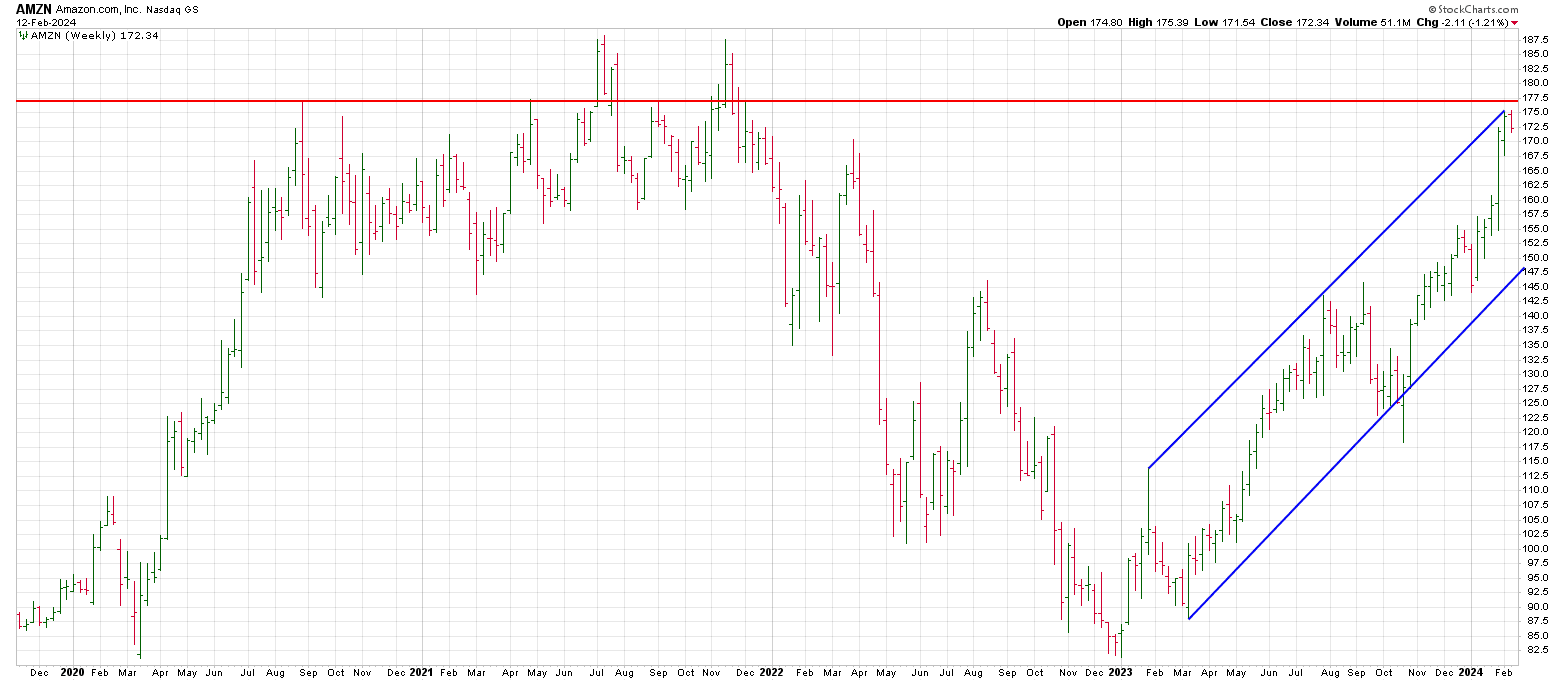 A weekly AMZN shows it is testing the region of the major breakdown pivot from March 2022.