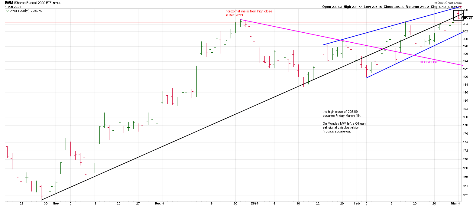 Yesterday IWM left a Gilligan sell signal closing below Friday’s square-out.