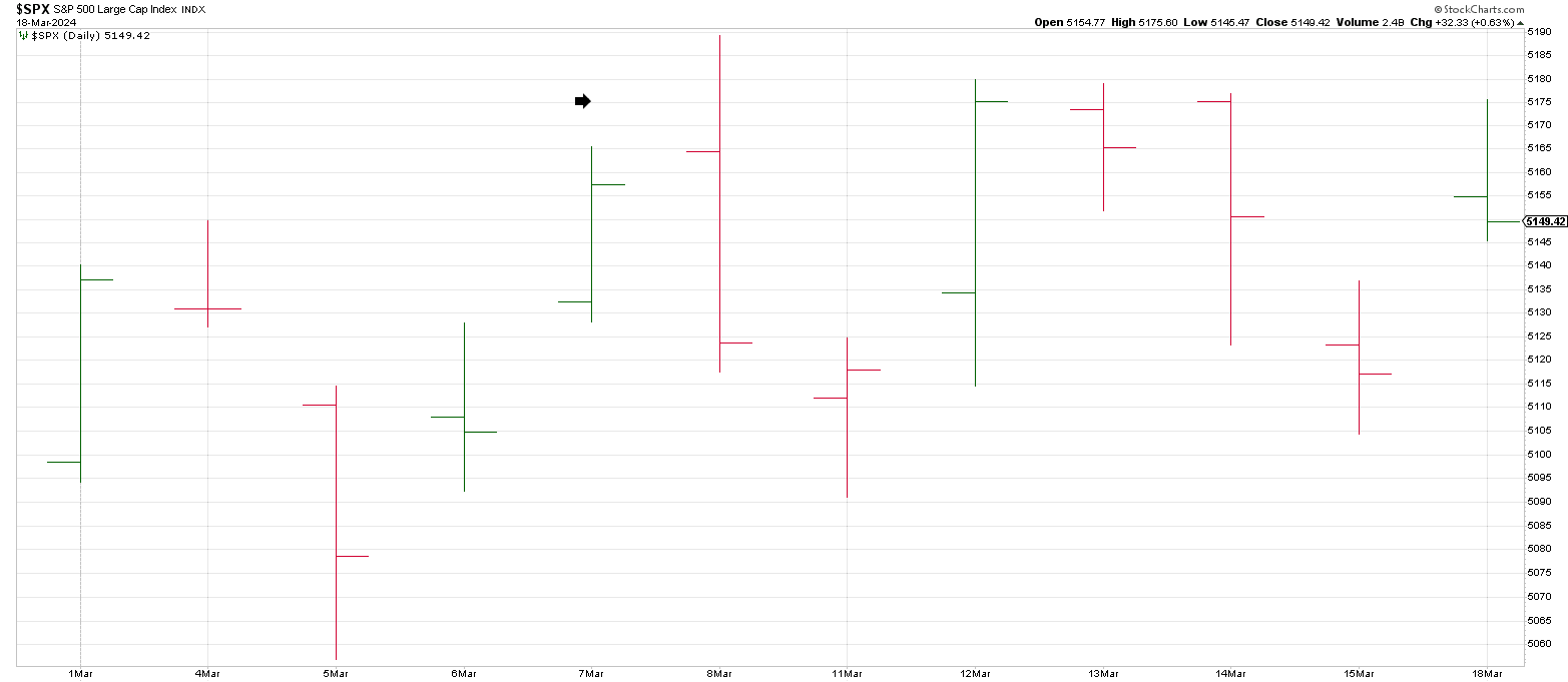 The SPX hasn’t struck a new high since its March 8th Key Reversal Day which kept a lid on the market.