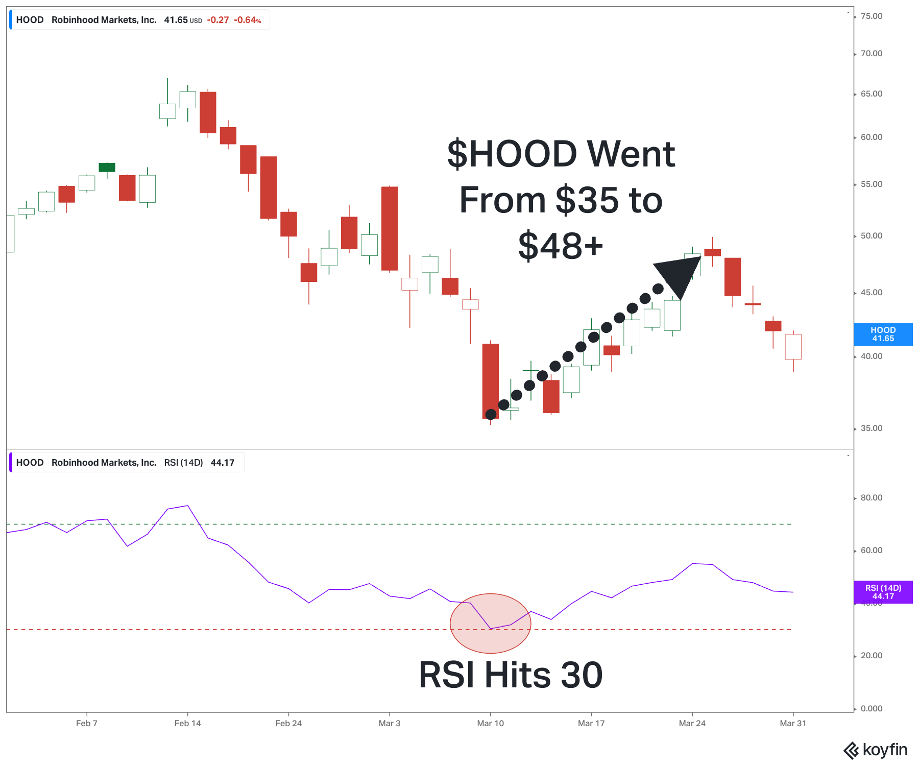 RSI hit 30 to mark a bottom in HOOD. The stock then rallied from $35 to $48+: