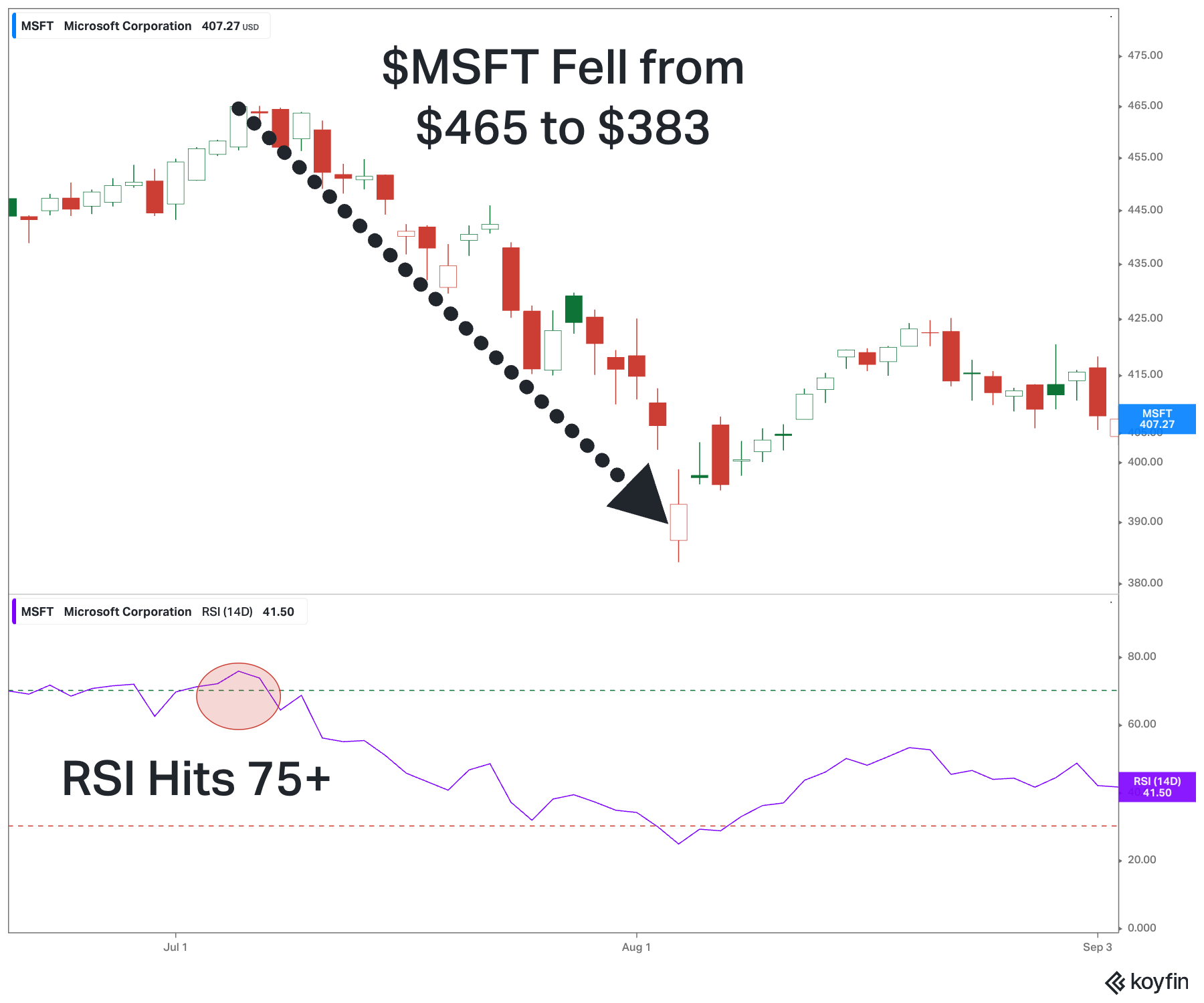 And RSI above 70 can mean a stock is topping out. In July of 2024, Microsoft’s (MSFT) RSI went over 75. That marked a peak in the stock, and it fell from $465 to $383.