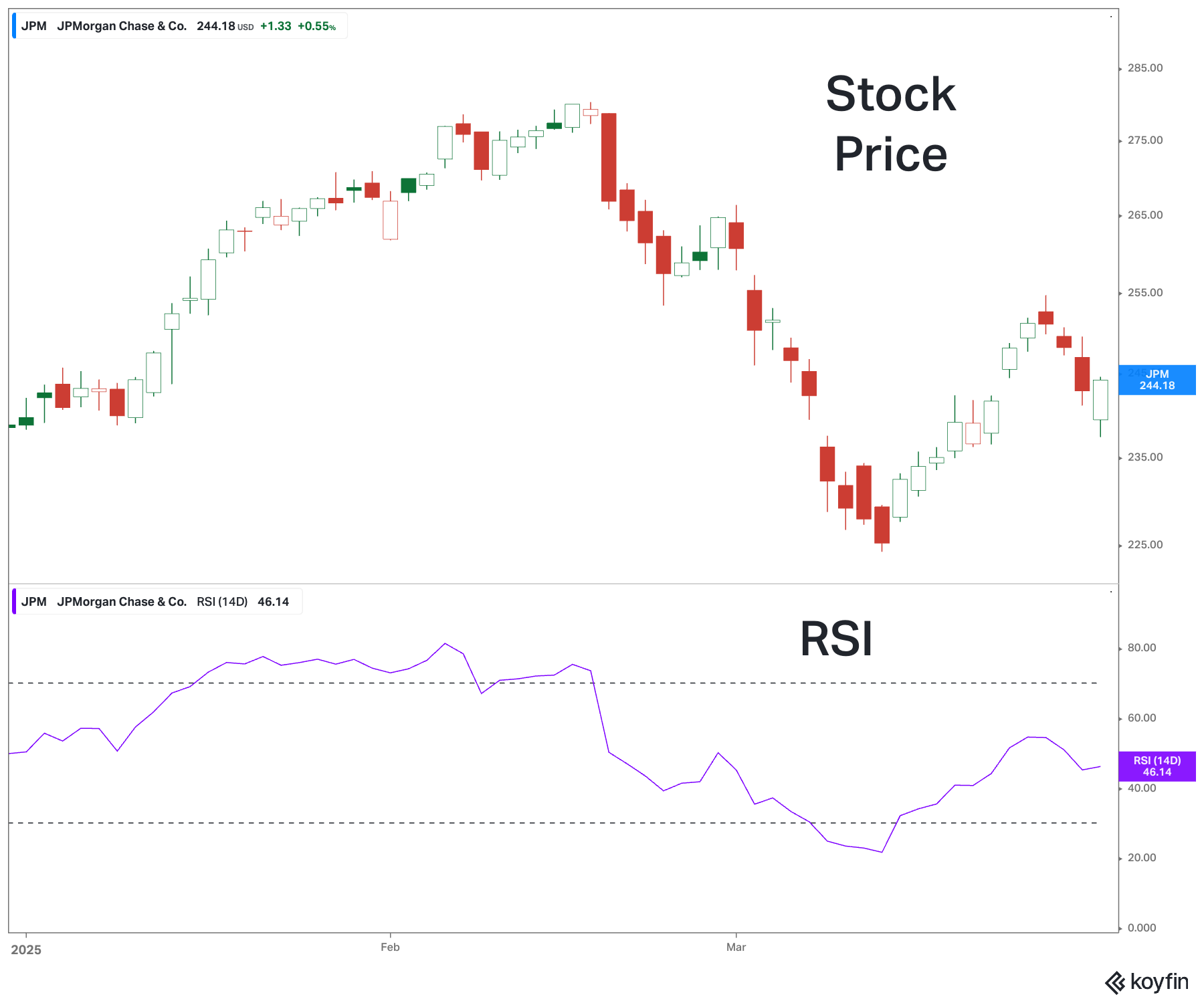 In this article, you’ll see charts with 2 sections — the stock price on top, and RSI on bottom: