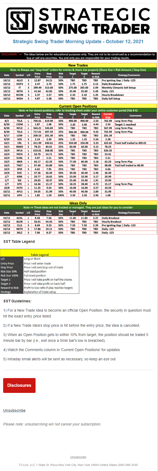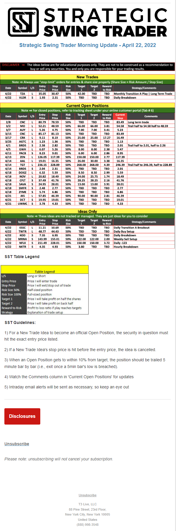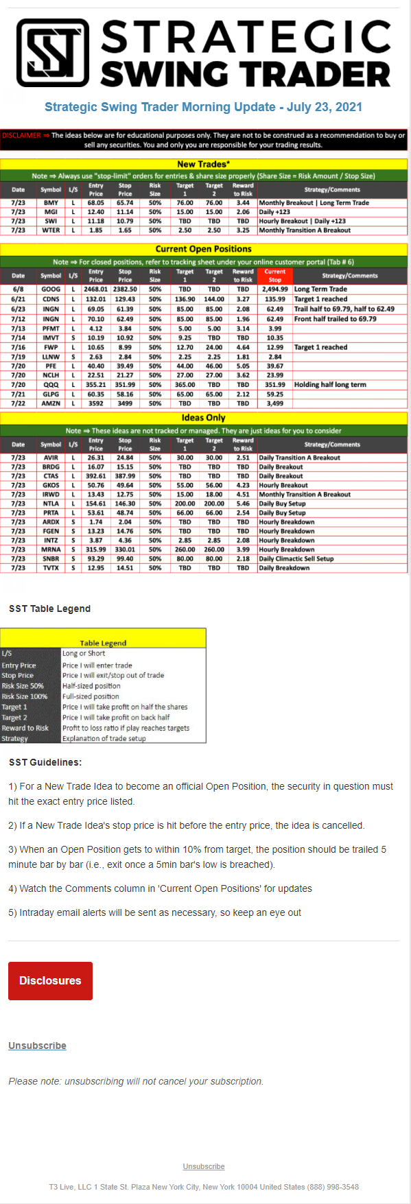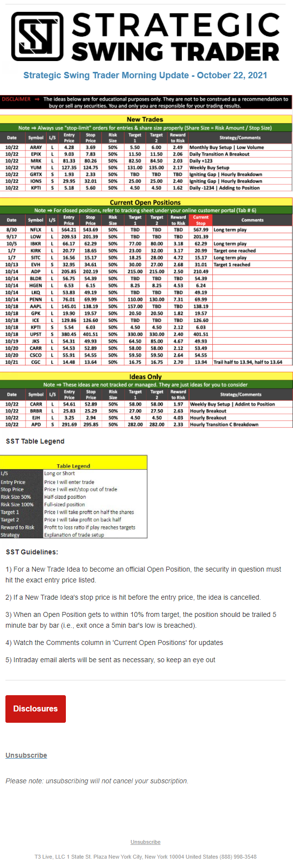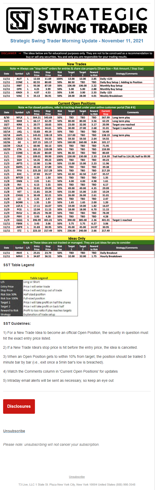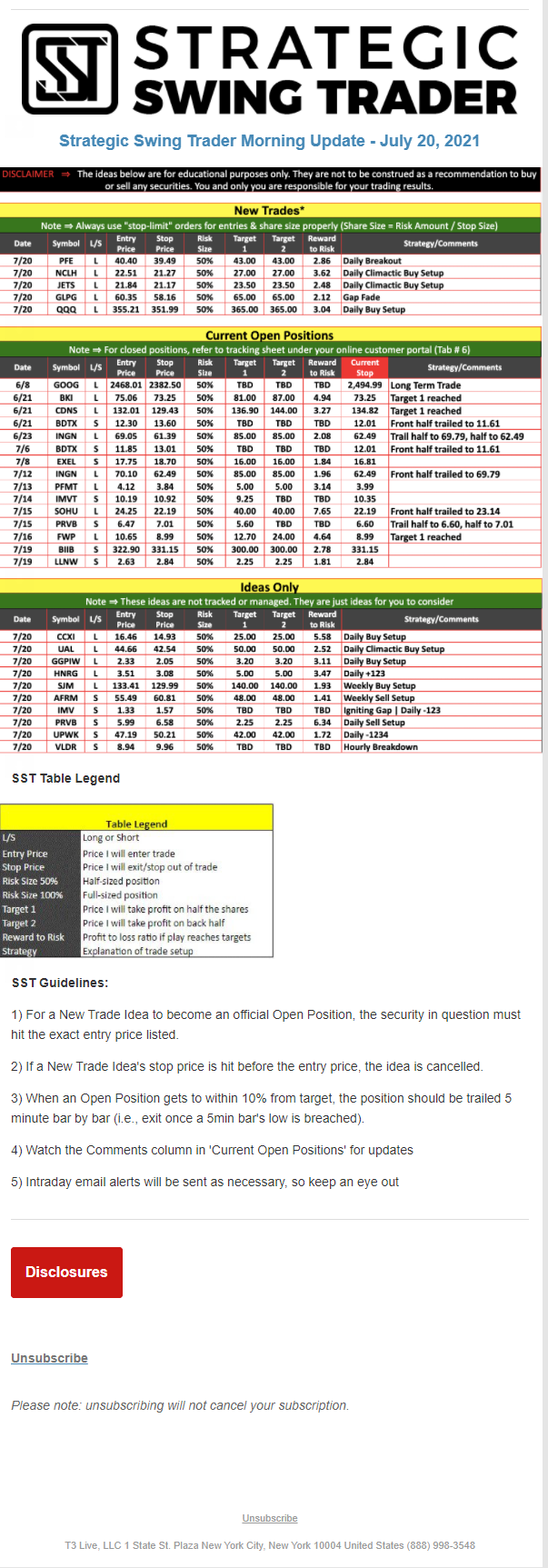 The programs that T3 Live distributes (including the “Virtual Trading Floor®,” articles, commentary, videos, blogs and social media postings) are for informational and educational purposes only. No one should consider the information disseminated by T3 Live to be personalized investment advice, a recommendation to buy, sell or hold any investment, an offer (or a solicitation of an offer) to buy or sell any investment, or the provision of any other kind of advice that would require T3 Live to register as a broker-dealer, investment adviser or similar entity. No one associated with T3 Live is authorized to make any representation to the contrary.