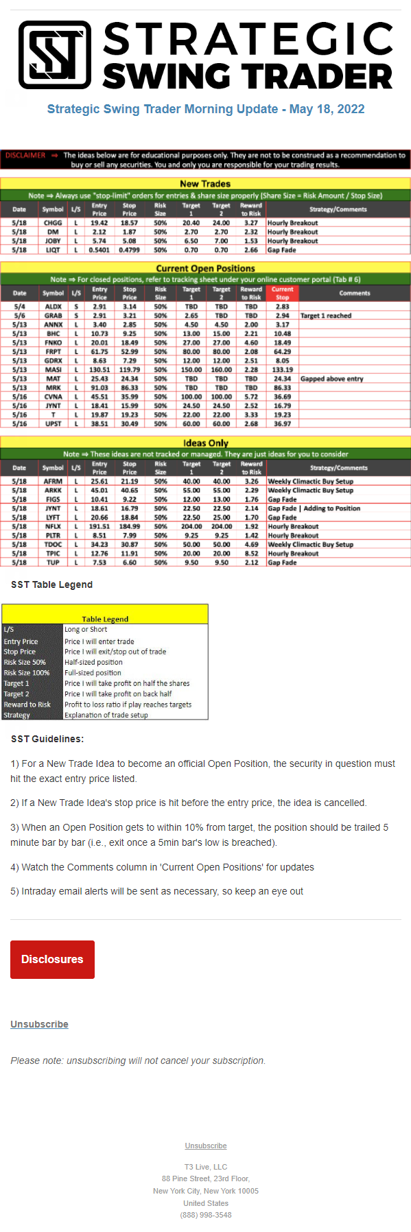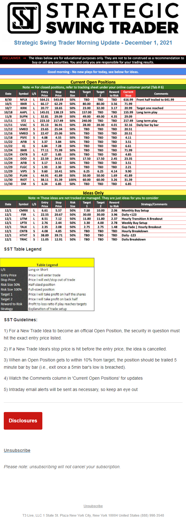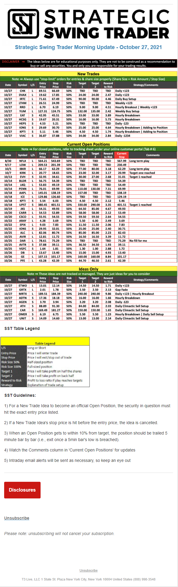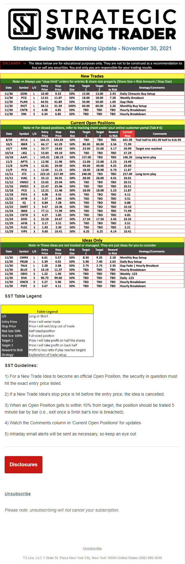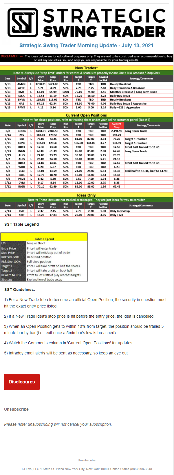 The programs that T3 Live distributes (including the “Virtual Trading Floor®,” articles, commentary, videos, blogs and social media postings) are for informational and educational purposes only. No one should consider the information disseminated by T3 Live to be personalized investment advice, a recommendation to buy, sell or hold any investment, an offer (or a solicitation of an offer) to buy or sell any investment, or the provision of any other kind of advice that would require T3 Live to register as a broker-dealer, investment adviser or similar entity. No one associated with T3 Live is authorized to make any representation to the contrary.