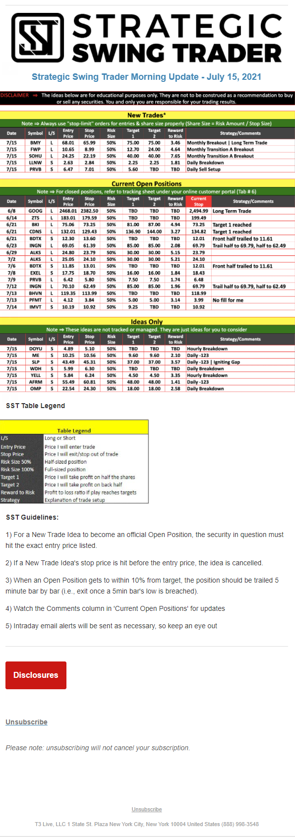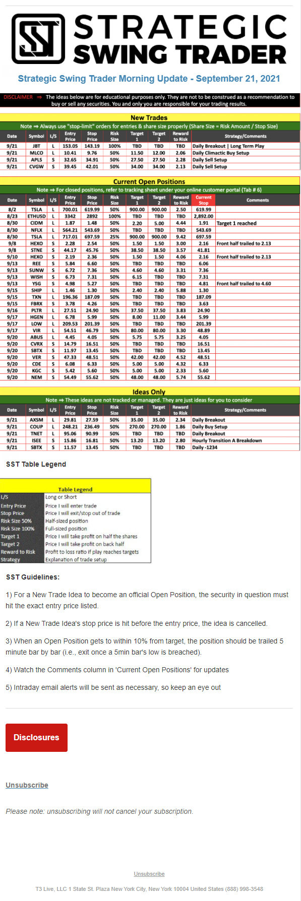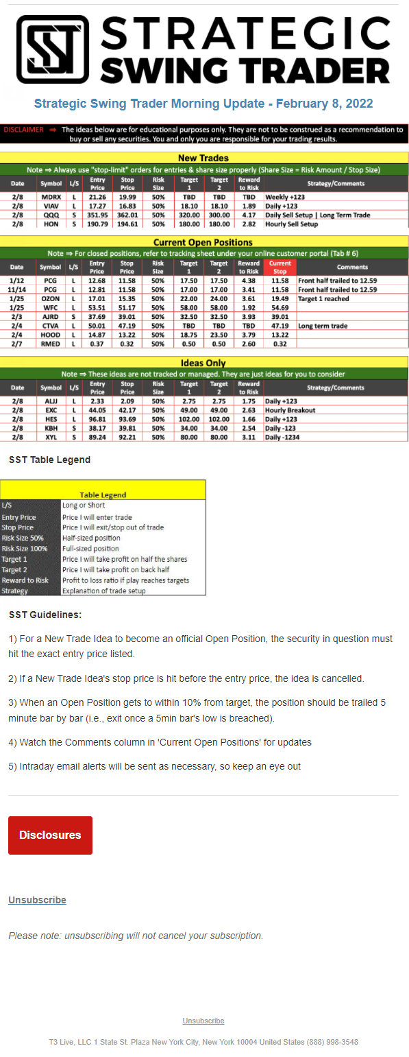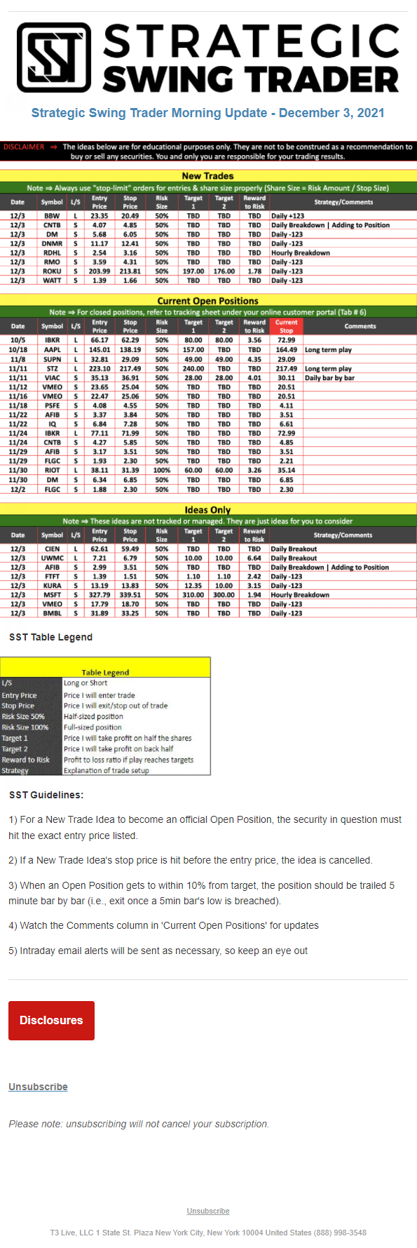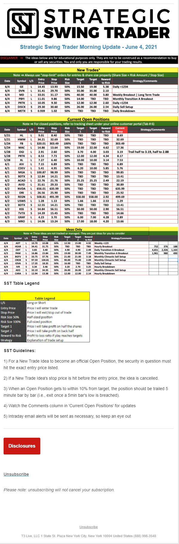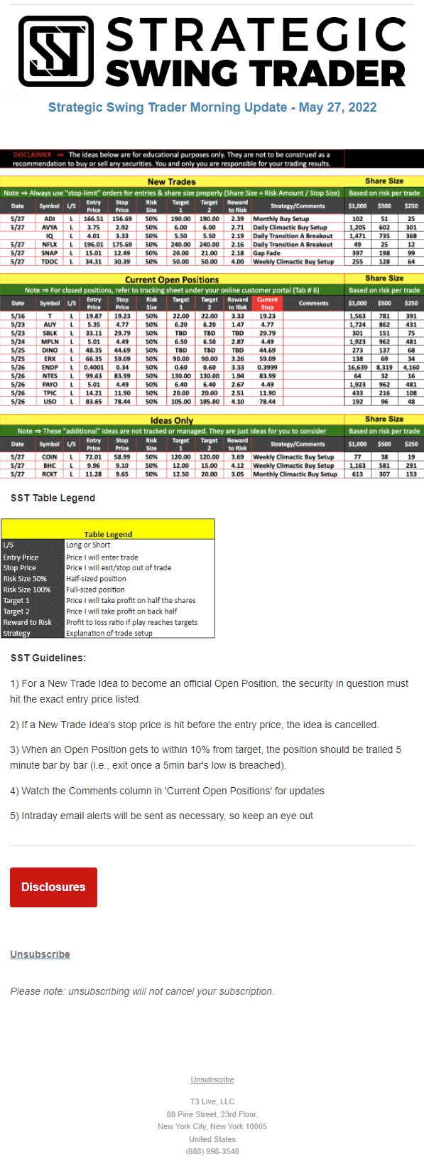 The programs that T3 Live distributes (including the “Virtual Trading Floor®,” articles, commentary, videos, blogs and social media postings) are for informational and educational purposes only. No one should consider the information disseminated by T3 Live to be personalized investment advice, a recommendation to buy, sell or hold any investment, an offer (or a solicitation of an offer) to buy or sell any investment, or the provision of any other kind of advice that would require T3 Live to register as a broker-dealer, investment adviser or similar entity. No one associated with T3 Live is authorized to make any representation to the contrary.