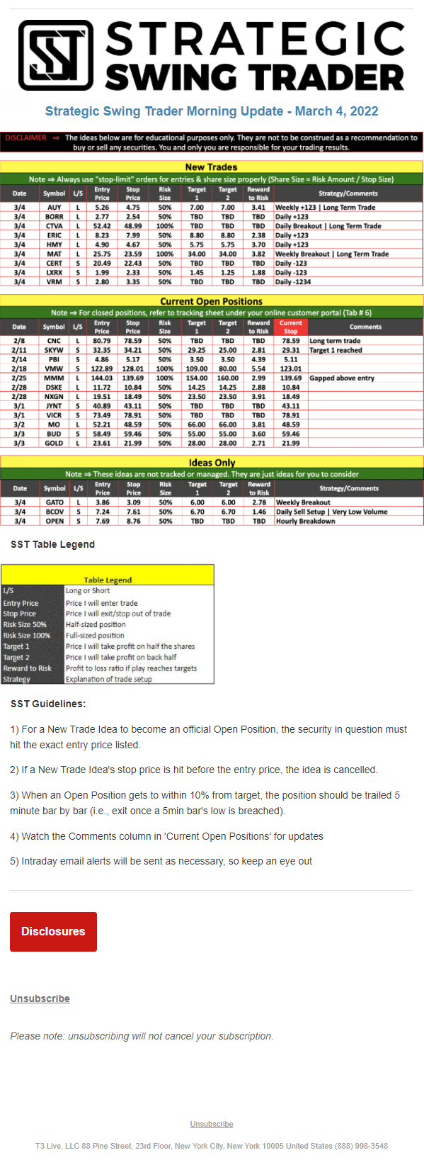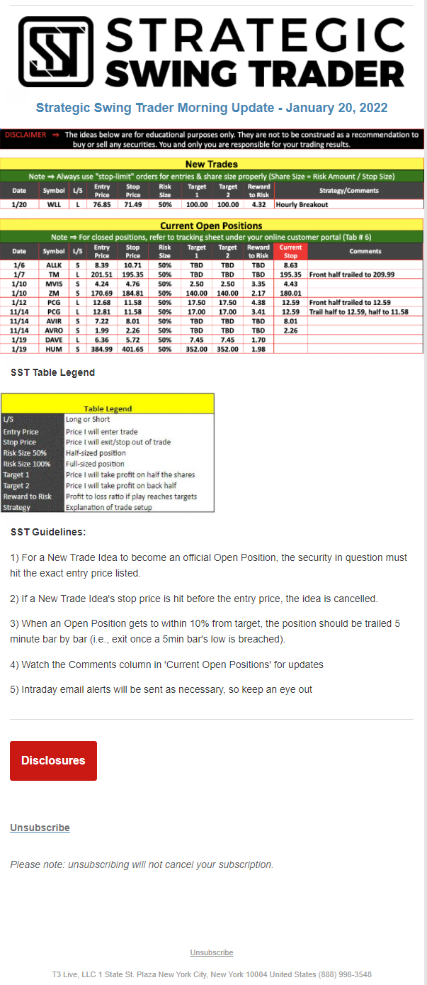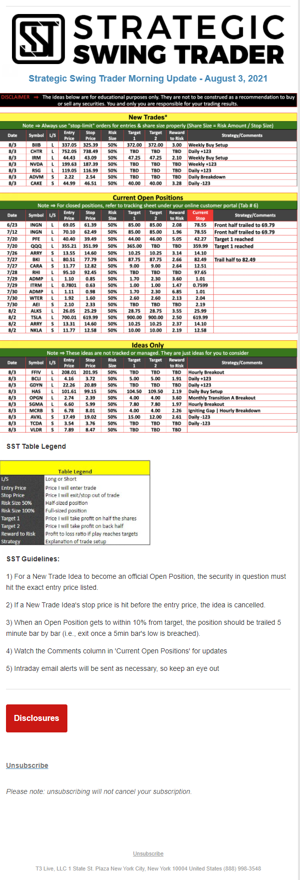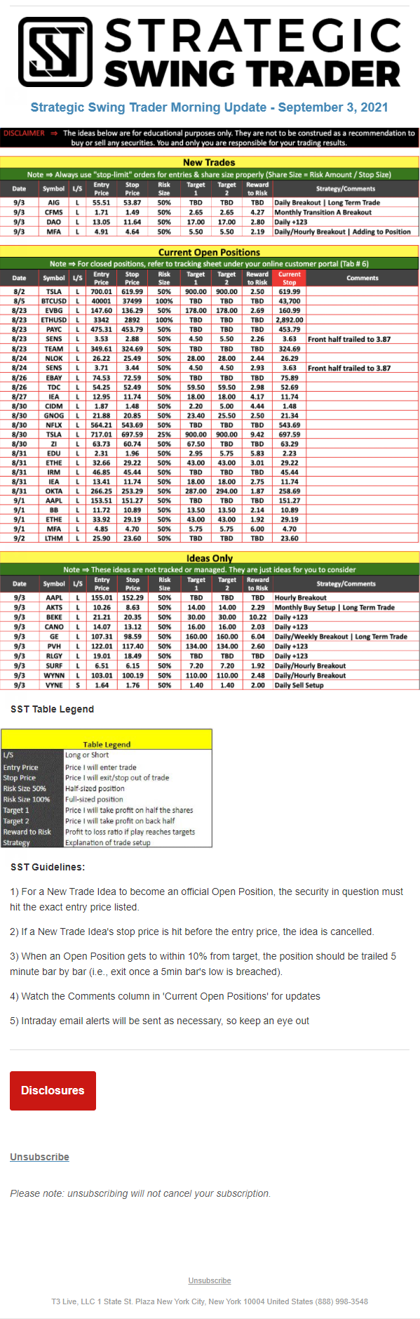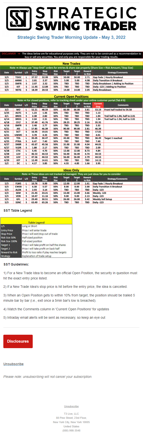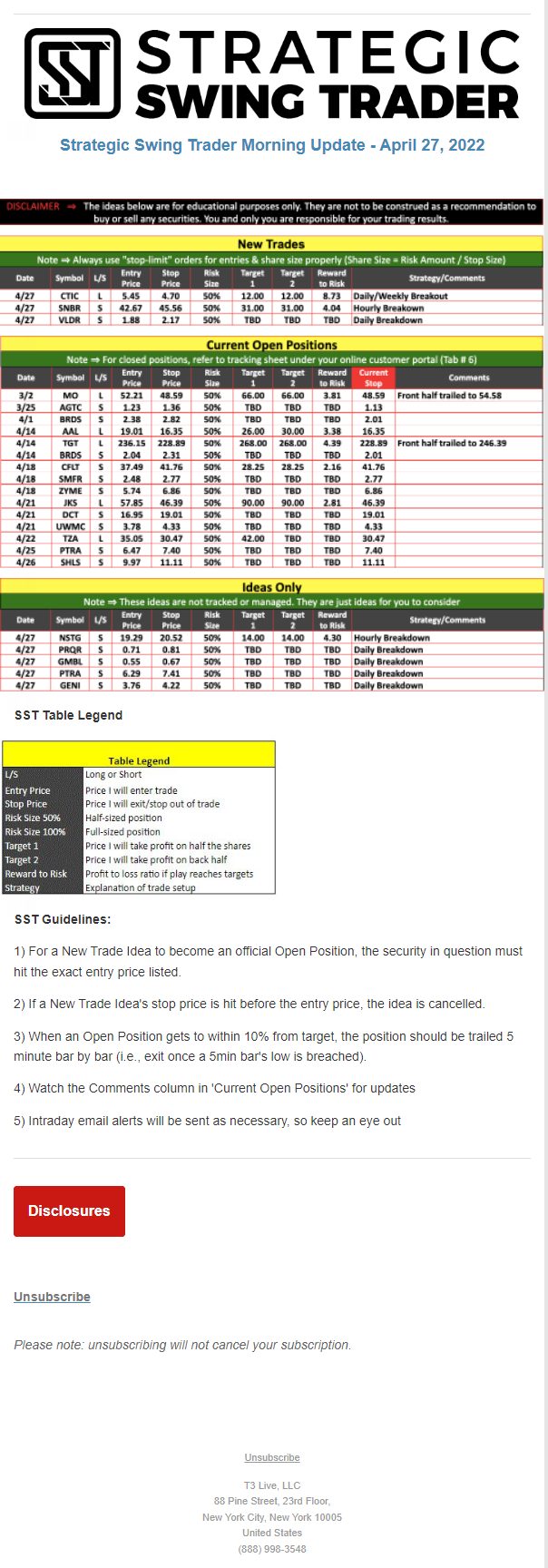 The programs that T3 Live distributes (including the “Virtual Trading Floor®,” articles, commentary, videos, blogs and social media postings) are for informational and educational purposes only. No one should consider the information disseminated by T3 Live to be personalized investment advice, a recommendation to buy, sell or hold any investment, an offer (or a solicitation of an offer) to buy or sell any investment, or the provision of any other kind of advice that would require T3 Live to register as a broker-dealer, investment adviser or similar entity. No one associated with T3 Live is authorized to make any representation to the contrary.